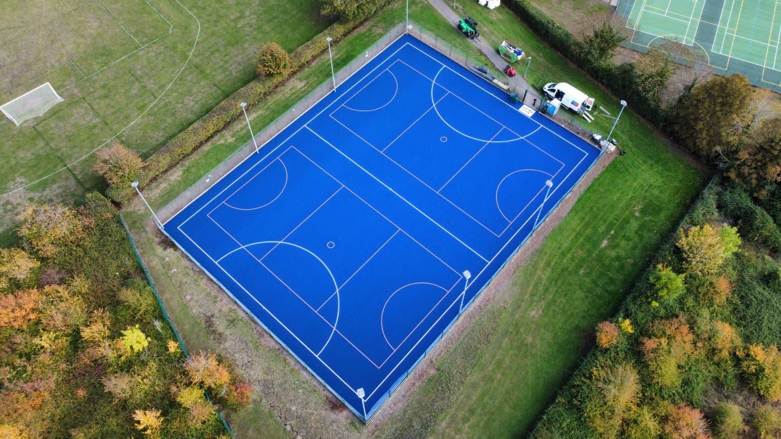 The completed blue synthetic surface with clear netball and multi-sport line markings, ready for PE and fixtures.